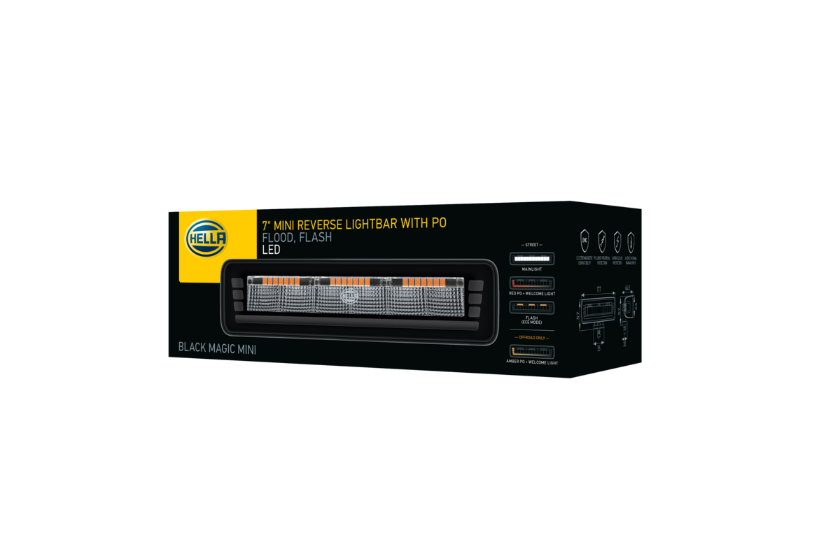 - HELLA Black Magic Edgeless Pro Mini 7″ reverse lamp with flood beam pattern and warning flash function. Robust aluminium housing with electrophoresis coating.